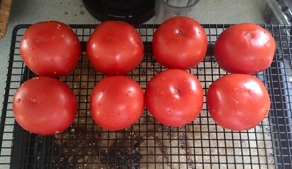 Another side dish! These tomatoes were very easy to make. First you cut off the tops. Sprinkle with salt, and turn them over to drain. I doubled this recipe.