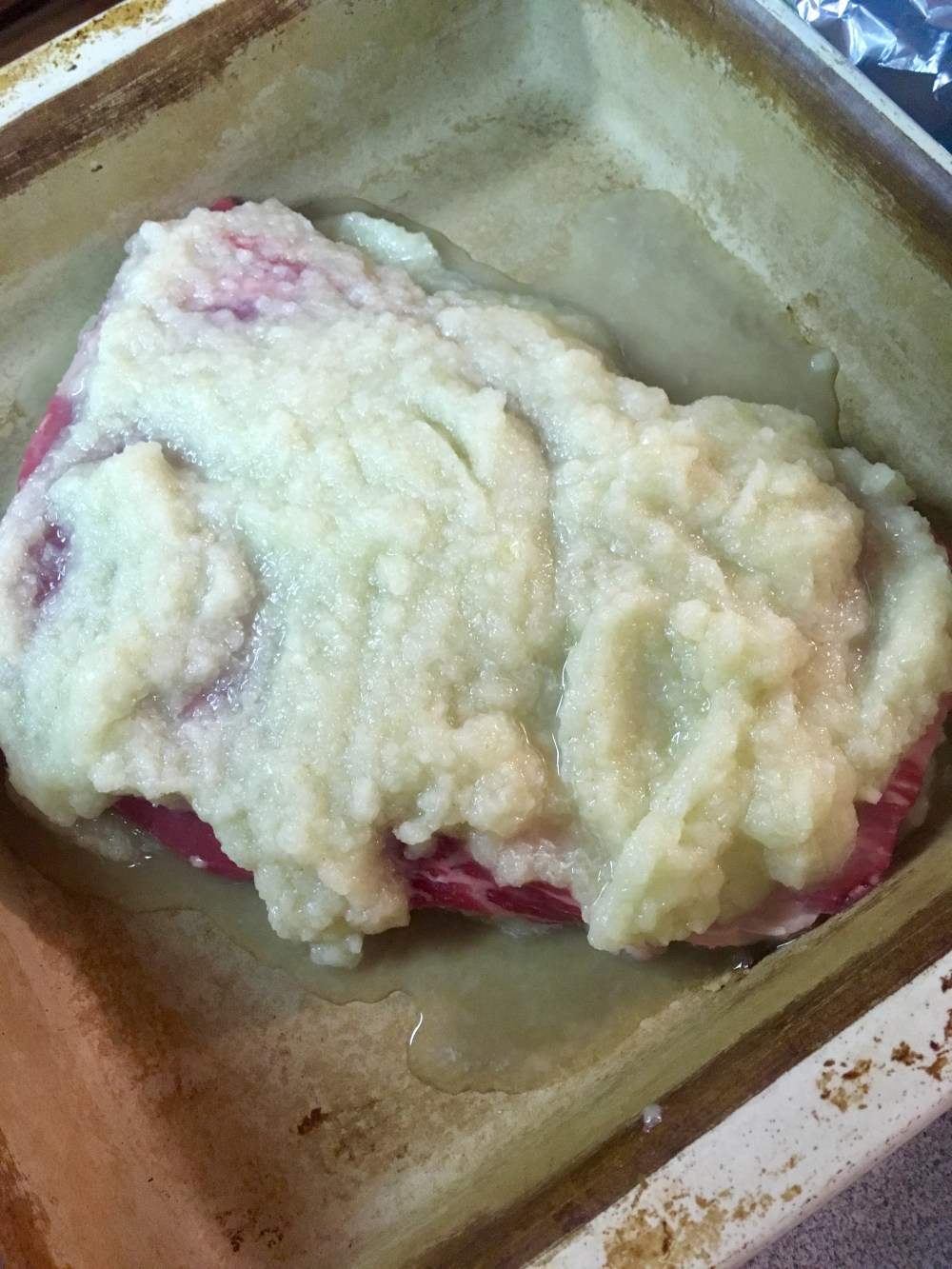 Marinating the meat with this totally interesting marinade made out of onions, garlic, lime juice, and cumin.