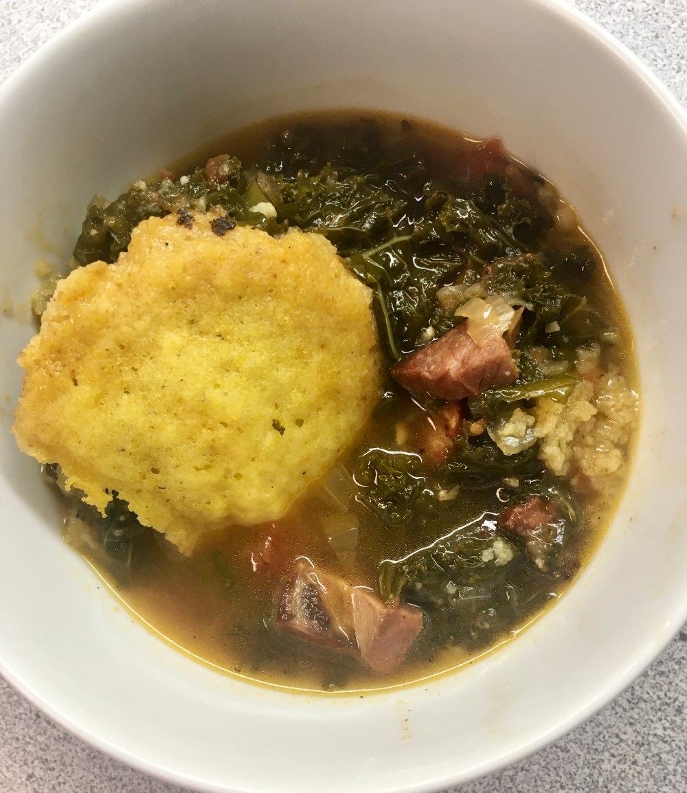 The cornmeal dumplings on top cooked up as a nice cornbread complement. That process reminded me of watching my mom make chicken and dumplings when I was younger.