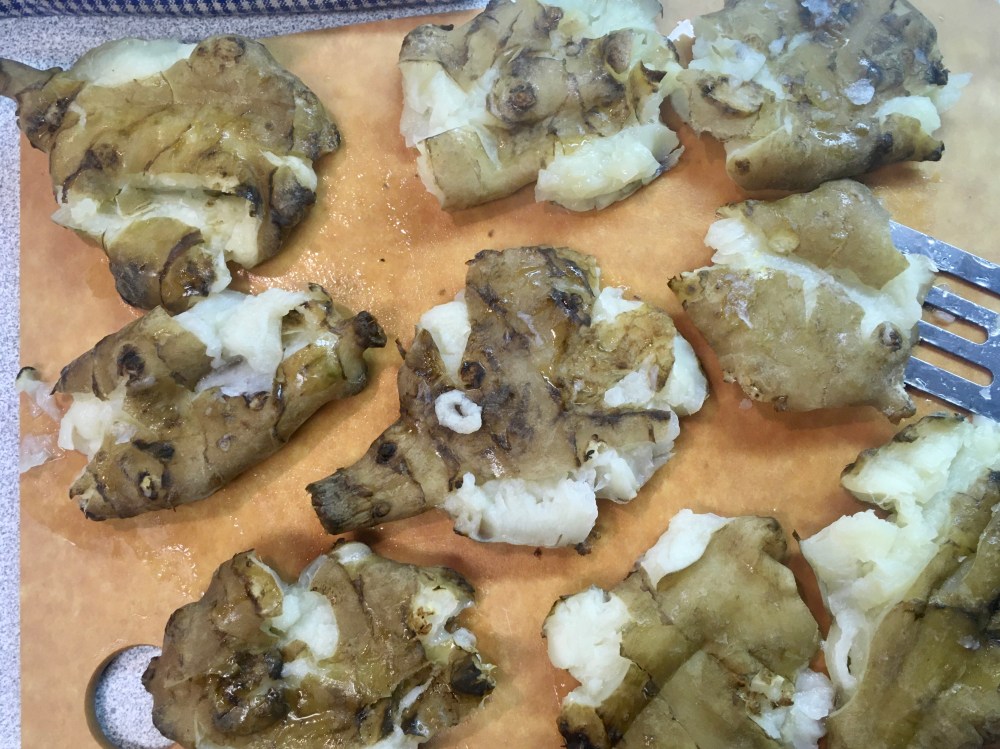 I read a lot online about roasting these in the oven, but with Sara’s method you boiled them in water (skin on), smashed them, and finished them off by frying them in a large skillet.