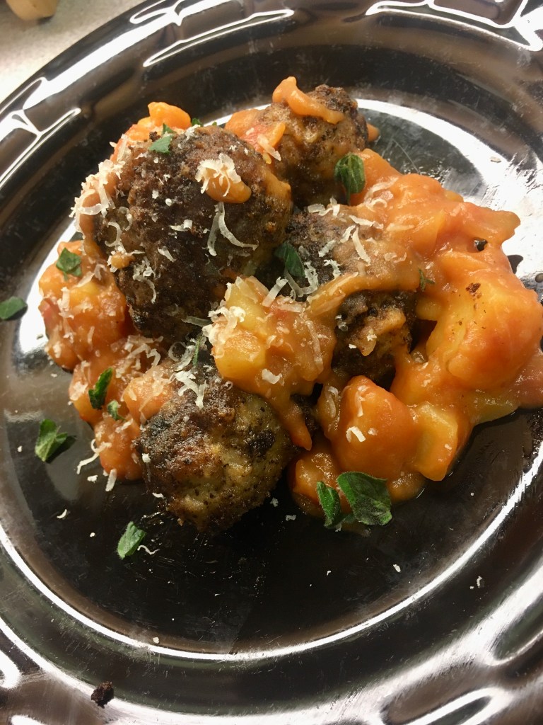 This meatball is made from a ground meat trifecta- beef, pork, and veal. It came together easily and while the meatballs chilled, I made the accompanying tomato and potato sauce.
